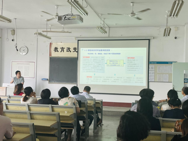 张彪从人才培养目标的确定,培养目标、毕业要求、课程体系的支撑关系设计,课程体系优化三个方面进行总结汇报。张彪指出,计算机科学与技术专业人才培养的目标,始终以“坚持一个理念、培养三种能力、具备三种素质、适应多类岗位”为主线,突出“软硬结合”的办学特色,致力于培养学生的综合应用能力。张彪从工程教育认证通用标准出发,从专业12条毕业要求方面阐述了培养目标、毕业要求、课程体系三者之间的支撑关系。他提到,课程体系的优化应凝练应用专业特色,以嵌入式开发为结合点形成软硬件两个课程群,对标标准全面覆盖,同时,从增加实践类课程、整合研究方向、学分优化等方面实现多元发展。