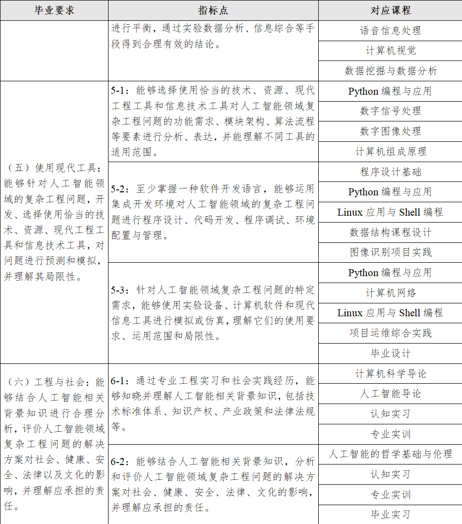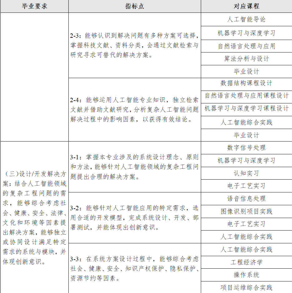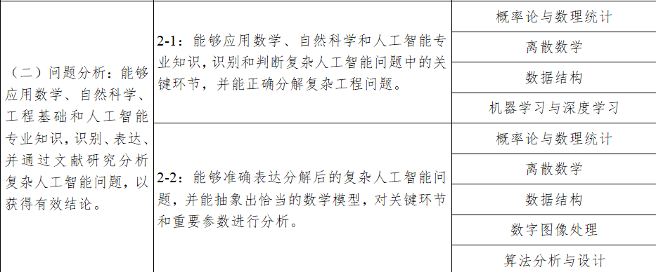 目标2:具备良好的系统分析与设计能力、程序设计与开发能力、运维与管理能力,能够运用专业知识、工程技术和分析工具研究、解决人工智能领域的复杂工程问题,并有一定的创新能力。