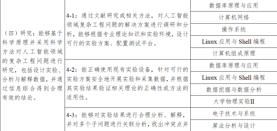 4.研究:能够基于科学原理并采用科学方法对人工智能领域的复杂工程问题进行研究,包括设计实验、分析与解释数据,并通过信息综合得到合理有效的结论。