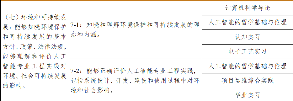 7.环境和可持续发展:能够知晓环境保护和可持续发展的基本方针、政策、法律法规,能够理解和评价人工智能专业工程实践对环境、社会可持续发展的影响。