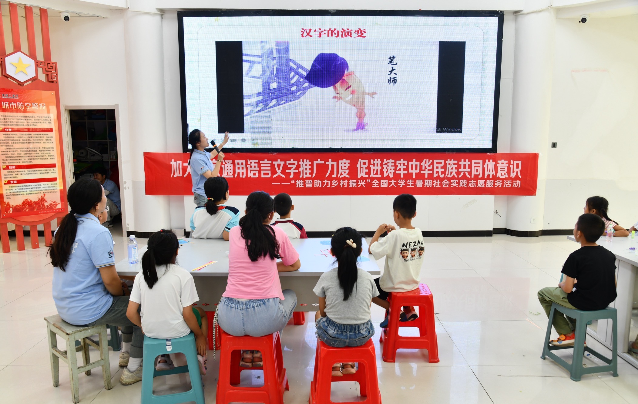 推普助力乡村振兴,青春使命砥砺前行。在此次“三下乡”社会实践活动中,"E启智普”服务队通过系统性词汇教学、双语对比训练、阶梯式闯关等多元形式,以寓教于乐的方式切实让孩子们在轻松愉快的环境中真切体会到普通话的音韵之美,更有效提升了他们的语言兴趣和开口表达的勇气。