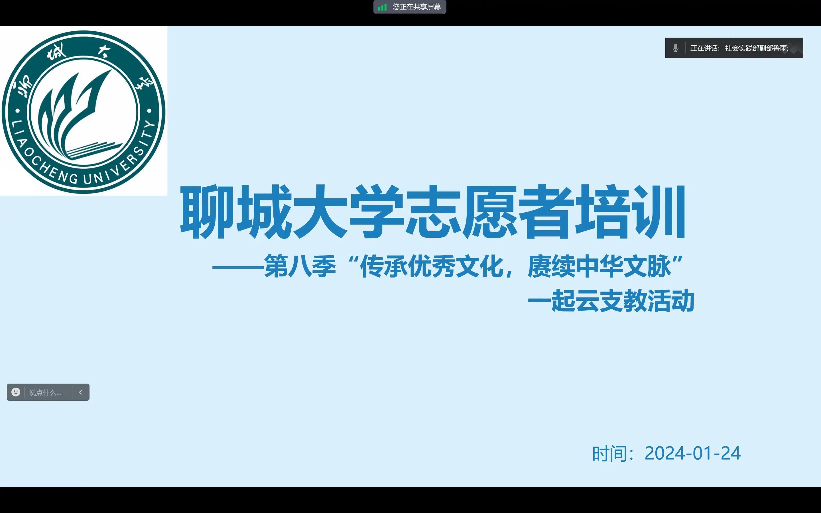 为深入学习贯彻习近平新时代中国特色社会主义思想和党的二十大精神,更好地引领广大青年弘扬志愿者服务精神,进一步激发他们的积极性、荣誉感和自觉性,1月24日,计算机学院于线上开展“传承优秀文化,赓续中华文脉”主题“一起云支教”活动志愿者动员大会,计算机学院社会实践部工作人员鲁雨担任主讲人。
