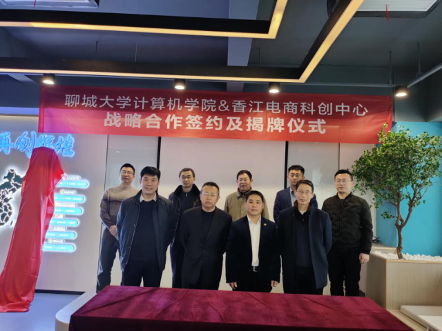 为深度推进校企融合,培养电商人才,带动大学生的创业热情,计算机学院与香江电商科创中心于12月9日进行座谈研讨,签署《战略合作协议》,开展基地成立揭牌仪式。聊城光彩置业总经理董海峰,香江管委会书记李新胜,香江管委会主任高忠峰,威九国际院长孟晗,计算机学院副院长李成友,计算机学院办公室主任李树榜,电子商务系主任刘广亮,教师、博士李德奎,计算机学院团委辅导员田飞,亚马逊聊城运营中心总监朱阳合,拓展总监李飞等一众领导莅临现场,共同见证了这一重要时刻。
