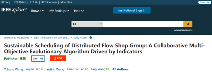 近日,计算机学院韩玉艳老师团队在进化计算领域顶级学术期刊《IEEE Transactions on Evolutionary Computation》(中科院1区Top,影响因子为14.3)上发表研究论文“Sustainable Scheduling of Distributed Flow Shop Group: A Collaborative Multi-objective Evolutionary Algorithm Driven by Indicators”(DOI: 10.1109/TEVC.2023.3339558.)。论文第一作者为硕士研究生王宇航,韩玉艳副教授、王玉亭副教授为通讯作者,上海大学潘全科教授和清华大学王凌教授参与并指导该研究。威九国际为论文第一署名单位。