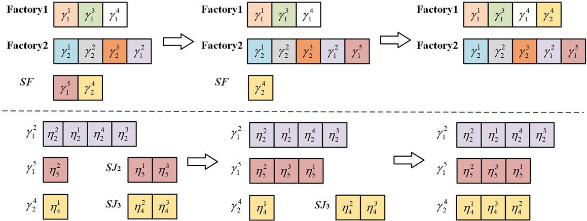 随后,引入指标驱动的协同多目标进化算法(CMOEA/I),在算法中,根据分而治之的思想,将问题分解成多个耦合子问题,开发一种基于种群的协作模型将子问题分别有效求解,同时,通过分析子问题间的内在联系,设计一系列将工厂、组和工件有效衔接的局部搜索算子(如图2所示)。