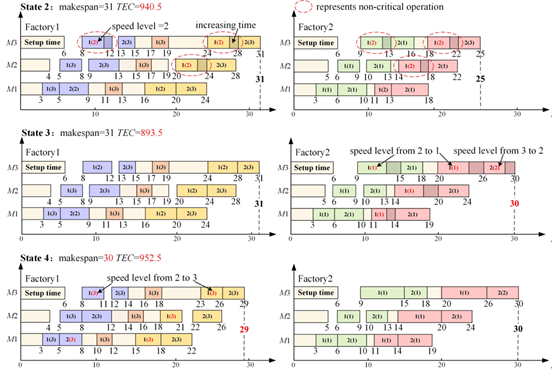 为了进一步探索潜在的非支配解,提出一种新型的变速策略,与以往大多数的变速策略不同的是,不单单从降速节能的角度来探索非支配解,而是基于降速节能和提速降低最大完工时间这两个原则,进一步得到更好的非支配解(如图4所示)。