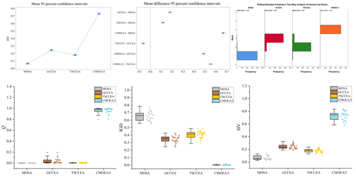 最后,在不同范围的测试实例上进行广泛的仿真实验。图5给出了所提CMOEA/I与其他先进的算法比较的结果,通过深入统计分析,验证了CMOEA/I的优越性。