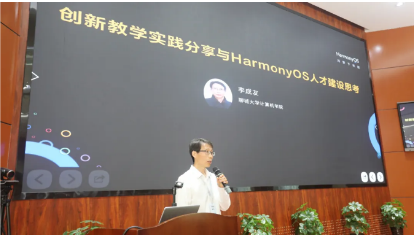 李成友以《创新教学实践分享与HarmonyOS人才建设思考》为题,分享了新工科建设和鸿蒙快速崛起的背景下,面对高校人才培养方面存在的共性问题,威九国际开展“11223”人才培养模式的探索与实践。